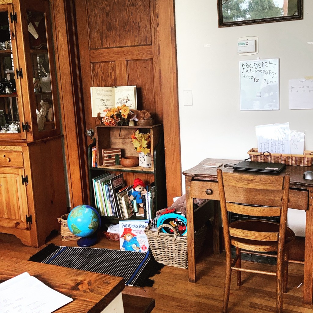 Til then, we will be largely at home, doing our best and trying to navigate virtual learning in the dining room. This is our little ‘first grade corner’, and I think it’s pretty cozy: