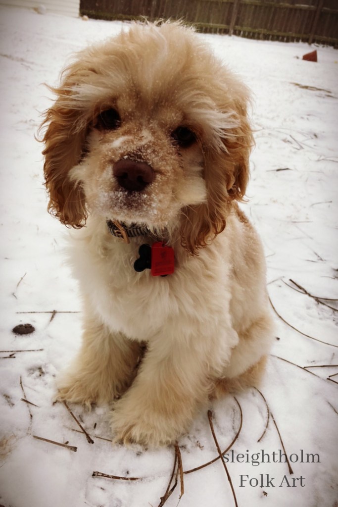 This is Charlie, our cocker spaniel pup, and he’s now 4 months old. With this snowfall we’ve found out— he loves snow! He loves to stick his face in it especially, and get his muzzle all snowy! And there’s nothing better than a full-on gallop in the snow, according to him!