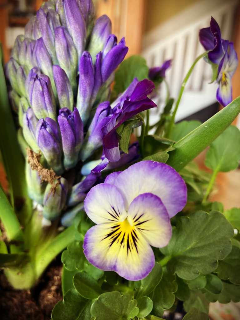 I also came upon a pot of just-about-to-bloom hyacinths and some pretty little pansies at the hardware store and planted them in a brass pot as a table display. When they’ve been thoroughly enjoyed and the blooms fade, I’ll plant the bulbs out in the garden so that they can bloom next year.