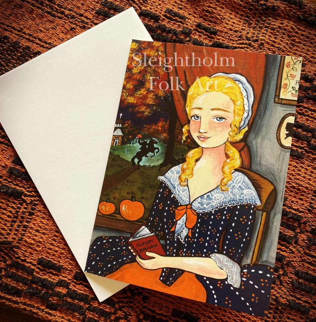 I did manage to get a very fun piece painted recently, inspired by Washington Irving’s story “The Legend of Sleepy Hollow”– this is Katrina Van Tassel! I’ve always thought she was an interesting character that needed exploring. How much did she know about The Headless Horseman who ran off her scheming suitor on a dark autumn night? From the look on her face in this piece, I think she may have had an idea….