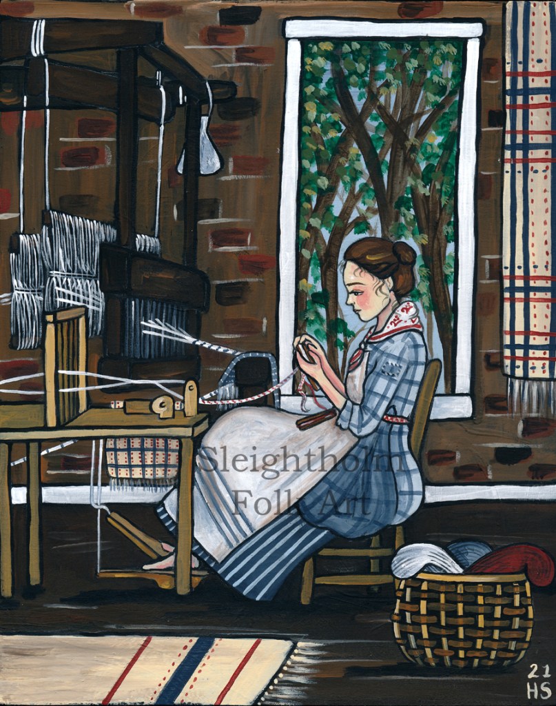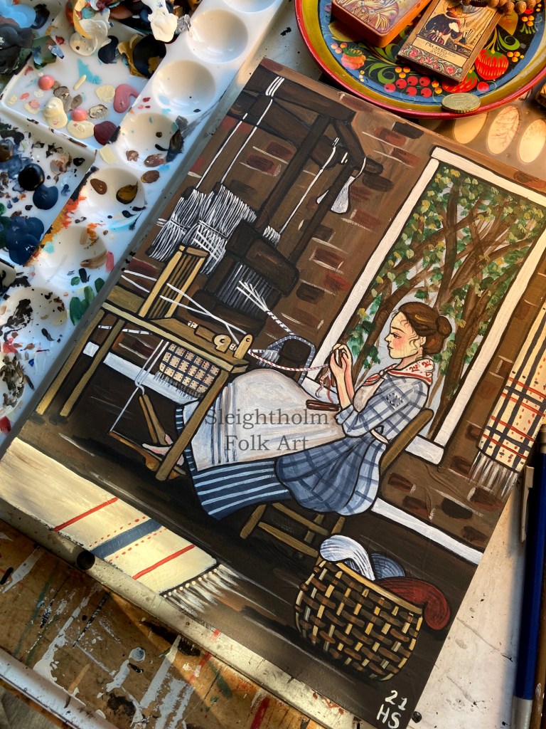 The inspiration from this piece came from a photo I saw taken by living history photographer Robert Clay. He’d taken a photo of a young woman at Historic Brattonsville, sitting at a tape loom in an amazing brick weaving house. It immediately sparked an idea for a painting and he was kind enough to agree! You can see this photo and more of his stunning work on his instagram and his website.