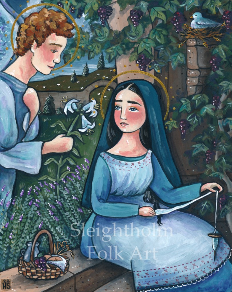 This painting came together very much as a meditation. When I first say down to paint it, the only plan I had for it was that Mary would be sitting on the steps of a garden with a drop spindle, looking behind her as the Angel Gabriel approached. As I worked, the garden began to take shape….I ‘built’ the stone walls and the landscape beyond. As I worked I thought of more and more elements to add— the dove of The Holy Spirit sits on a nest woven of wheat amongst the grape vines as a nod to the Eucharist. On the hills in the far distance I painted little sheep, surely watched over by a just-out-of-sight Good Shepherd.