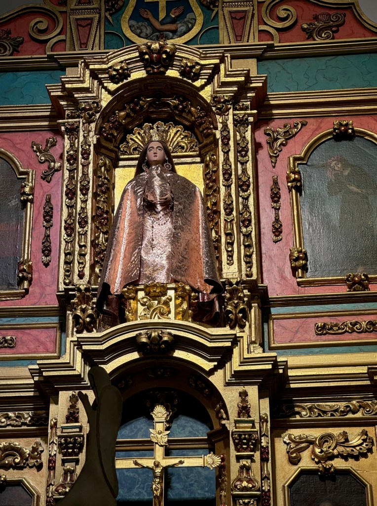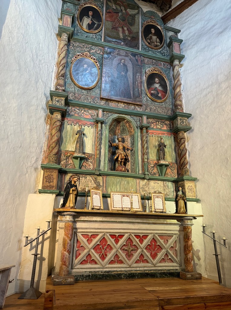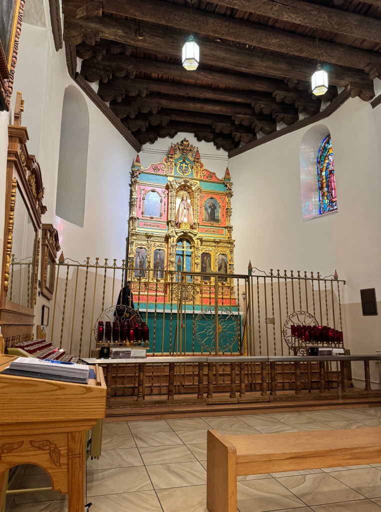 This church is so SO beautiful. It was built between the years of 1610 and 1625 and has stood as a place of worship under the flags of Spain, Mexico and now The United States. Inside, there is a beautiful Altar piece that was given to the chapel in the 18th century and features a statue of St Michael the Archangel (San Miguel) in a silver helmet. He once held scales of justice, which are now missing. Other saints featured on the altar screen include St. Francis, St. Teresa of Avila, St. Louis of France, St Gertrude and St. Clare of Assisi.