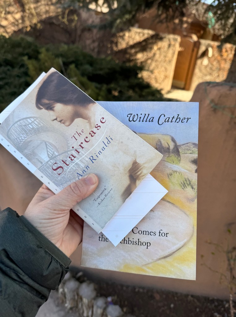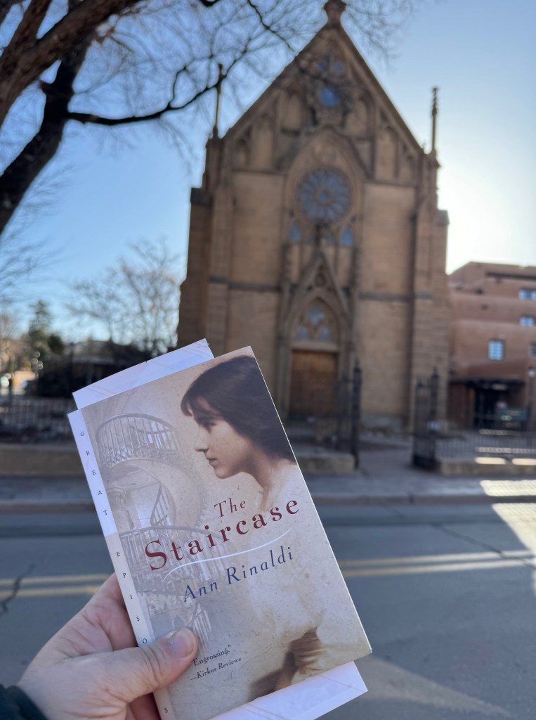 When we visited Santa Fe last spring, it was not only a dream trip for my mom, but a literary pilgrimage for me. When we were planning our stay and our adventures, I was thrilled to find that there were two churches that figured in two books I have read— and I was excited to see them. And not only was I able to visit The Cathedral Basilica of St. Francis of Assisi (which appears in Willa Cather’s novel “Death Comes for the Archbishop”,) I was also able to visit The Loretto Chapel with it’s famous staircase which is featured in the Ann Rinaldi Young Adult book called, well, “The Staircase.”
