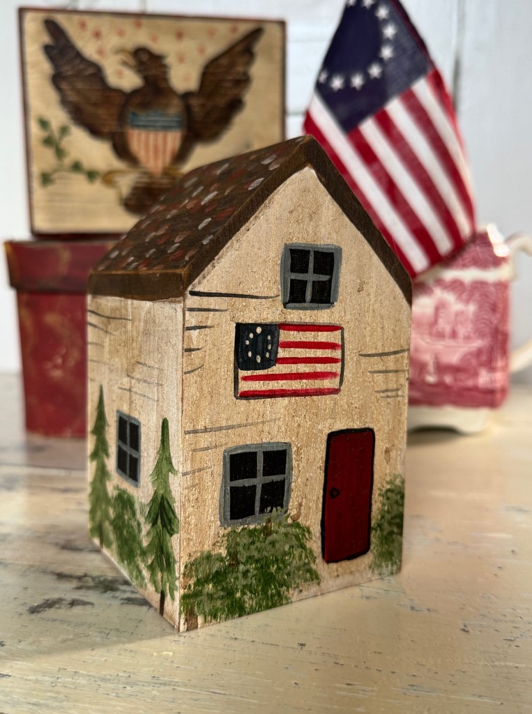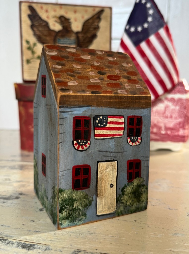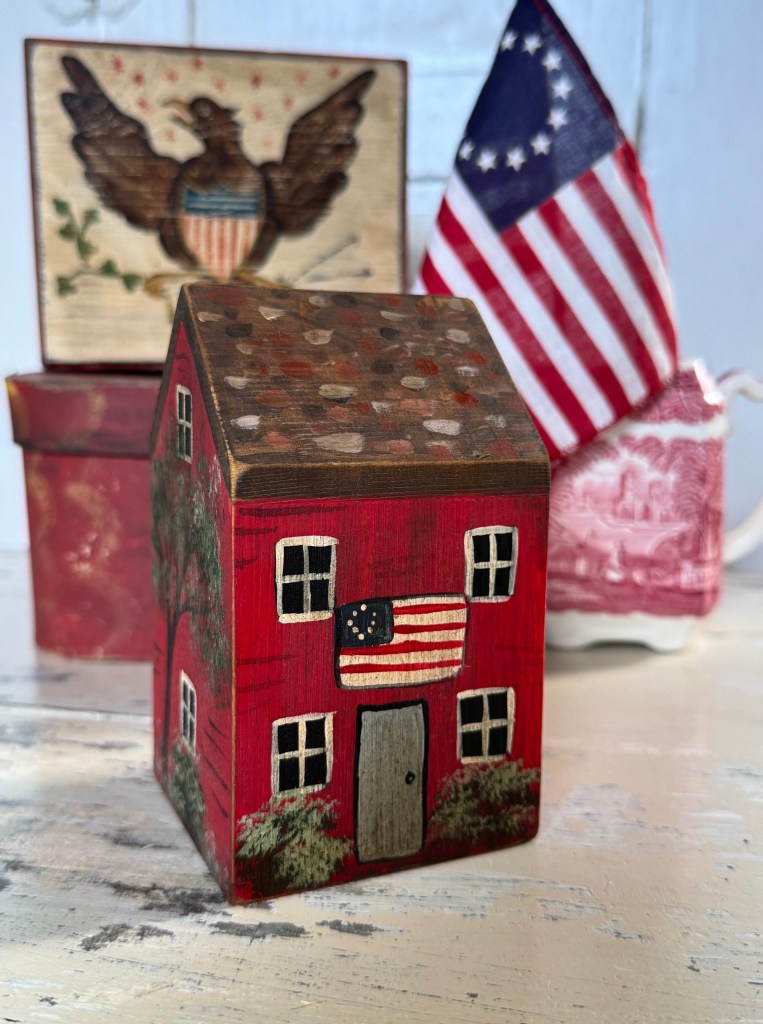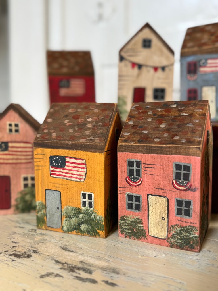 Good morning! I wanted to share with you a grouping of little Americana-inspired folk art houses that I will be listing in my Etsy shop today! The listings will go live today at 10 am CENTRAL TIME, and these houses are always popular!
